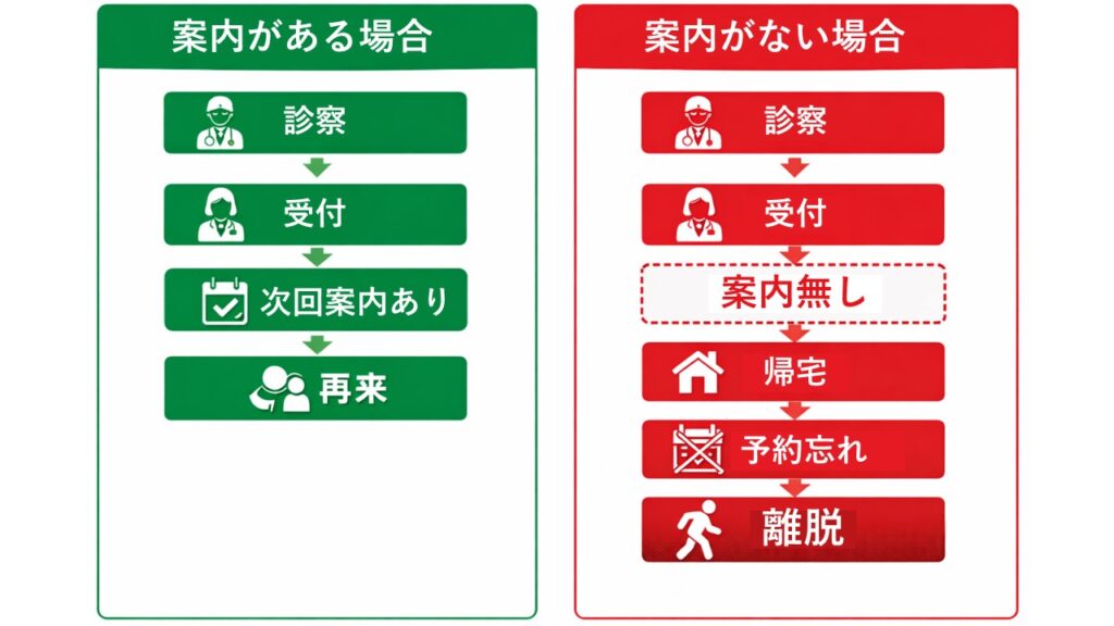 患者が来院してから帰宅するまでの体験の中で、次回の通院行動が整理されているかどうかが大きく影響します。