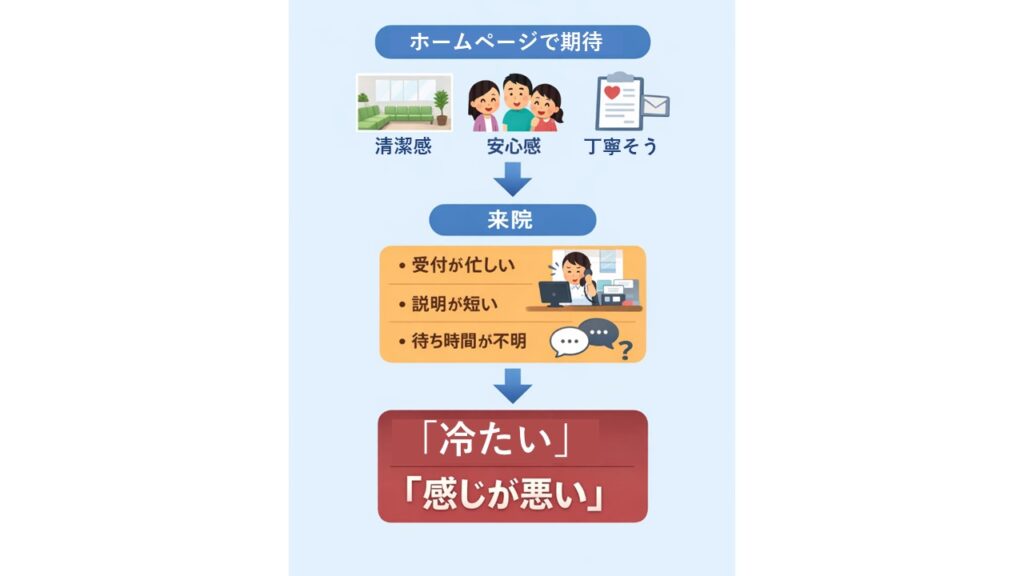 受付対応への不満は、単に「態度が悪い」という曖昧なものではなく、患者体験の中の特定の場面で生まれることが多いのです。
