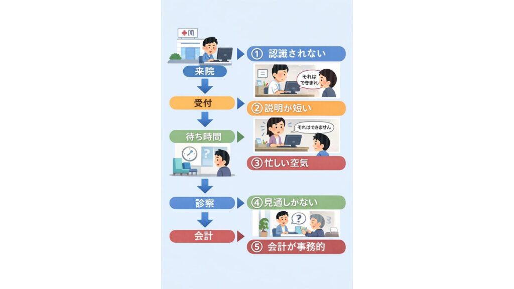 患者が不満を感じやすい5つの瞬間を整理していきます。