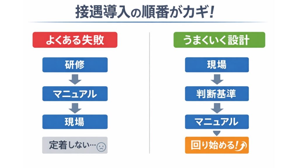 この順番で進めてしまうと、現場では運用が定着せず、接遇は形だけの取り組みになりやすくなります。
