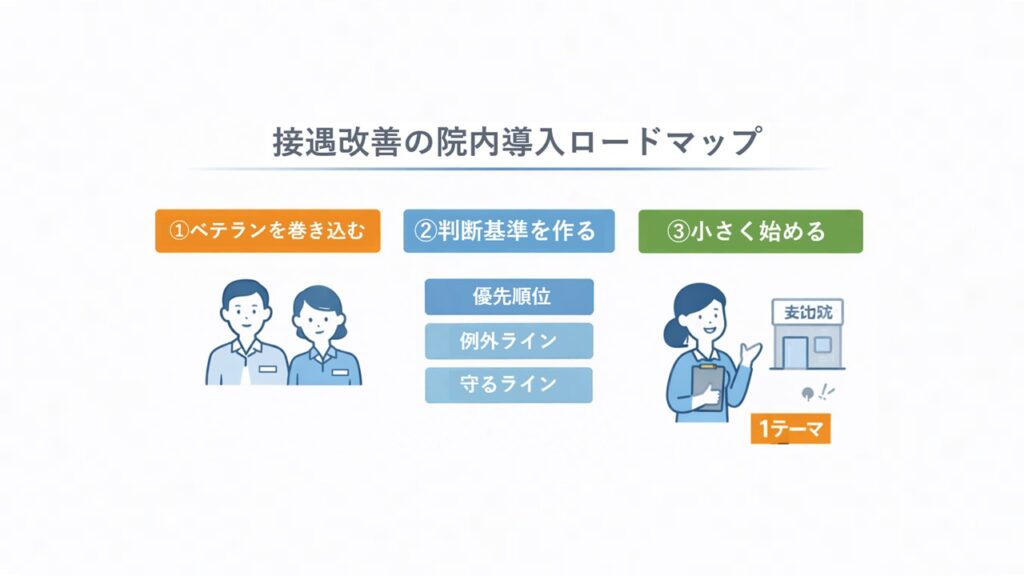 そのため、接遇改善を進める際には、まずベテランスタッフがどのような基準で判断しているのかを整理することが重要になります。どの場面で何を優先しているのか、どこまでを例外として認めているのかといった現場の判断を言葉にしていくことで、接遇設計は現実に合った形になります。
